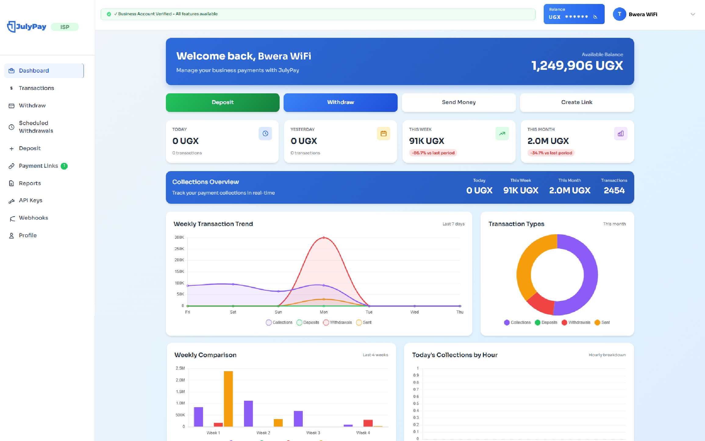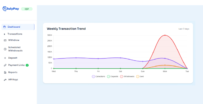 See how your collections perform over time, giving you a clear view of weekly income patterns on JulyPay. It helps you identify growth, track consistency, and spot any declines early, enabling better planning and smarter financial decisions.